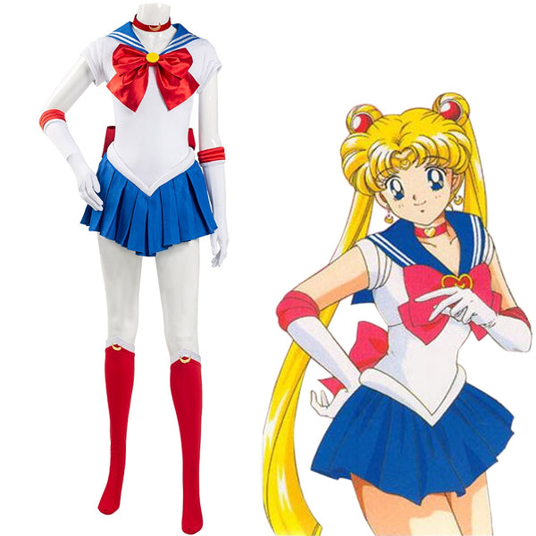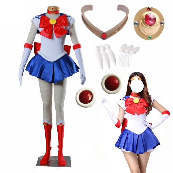SpecificationsCosplay WorksSailorMoonCharacters UsagiTsukinoCategory Cosplay SuitsGender FemaleMaterial Satin, Polyester, MicrofiberHemline ShortSleeve Length SleevelessPieces 1Includes Gloves, Cravat, Dress, Ribbon, Stockings
