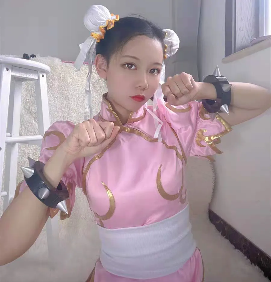 Anime Game Cosplay Pink Chun-Lili Faux Leather Pink cheongsam Fighters Cosplay Costume Halloween