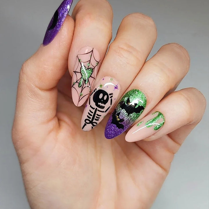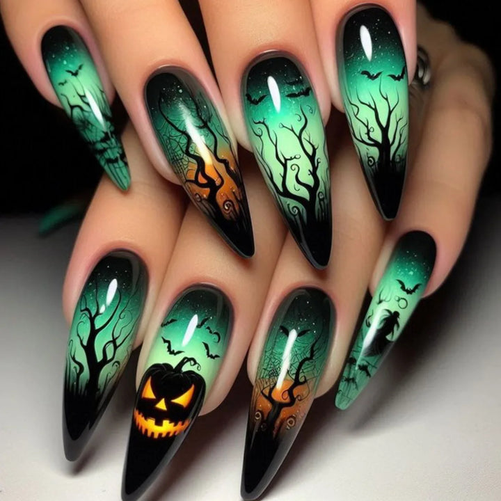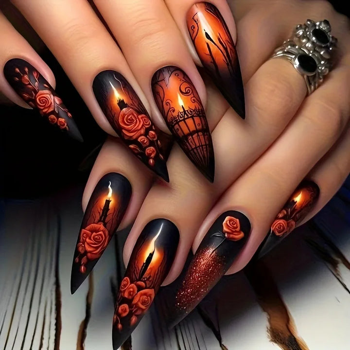 24pcs Long Almond Press on Nails Press on Halloween Spider Web Design Black Fake Nails Rhinestone Gradient Red Stick on Nail Tip