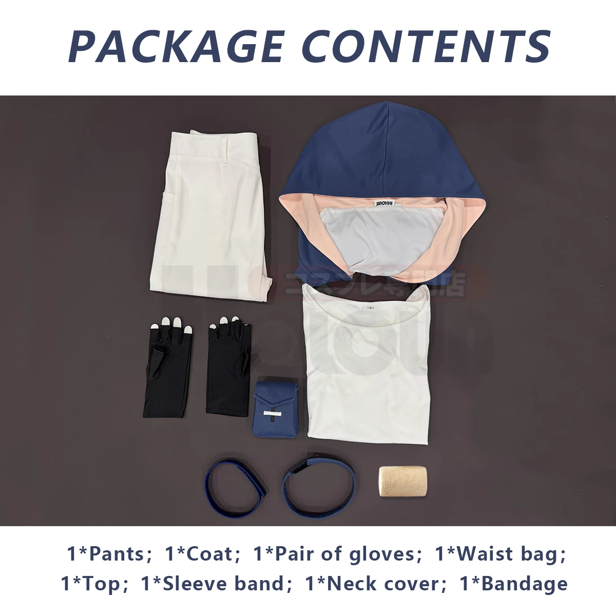 [Package Contents]:Costume only : 1*Pants;1*Coat; 1*Pair of gloves; 1*Waist bag,1*Top;1*Sleeve band;1*Neck cover; 1*Bandage