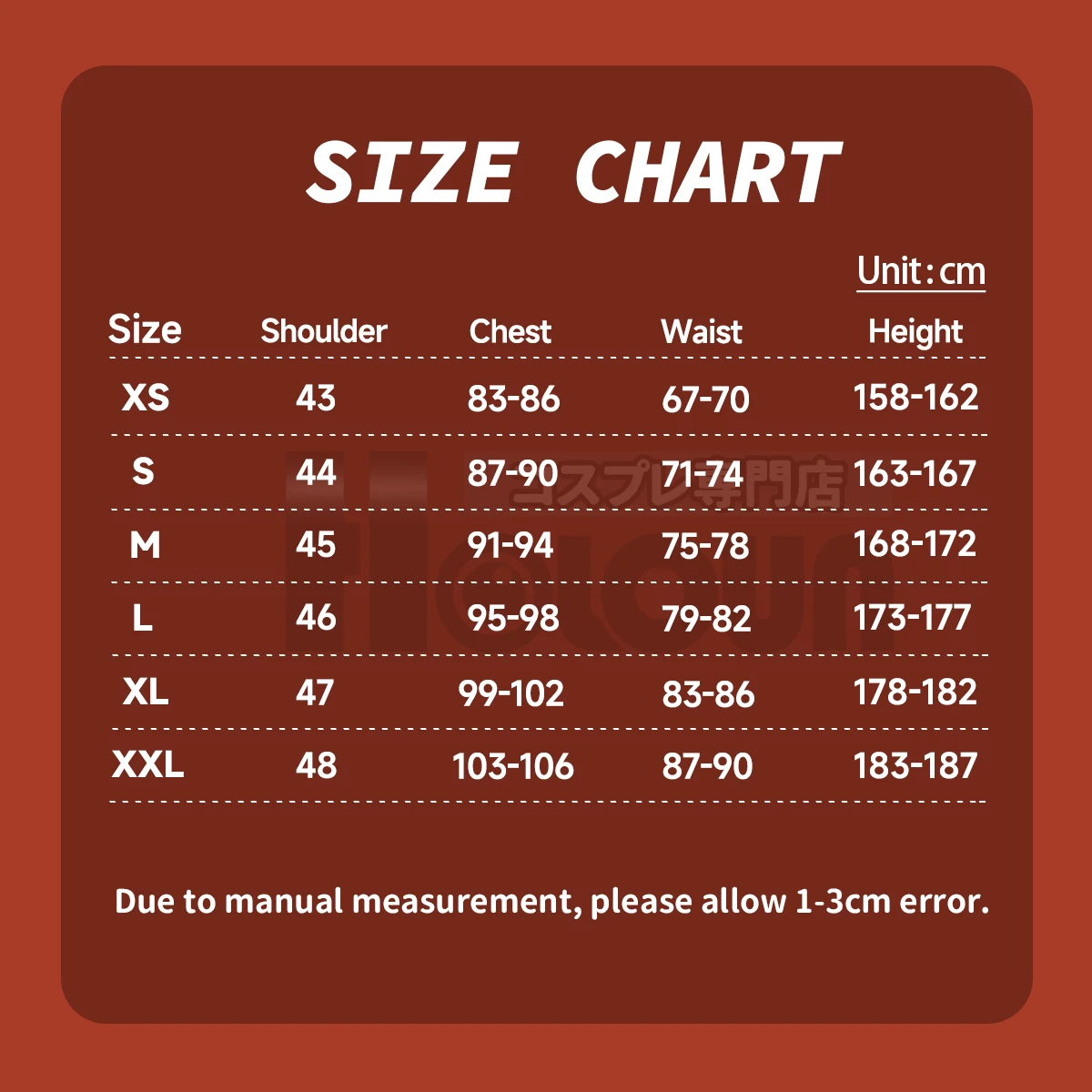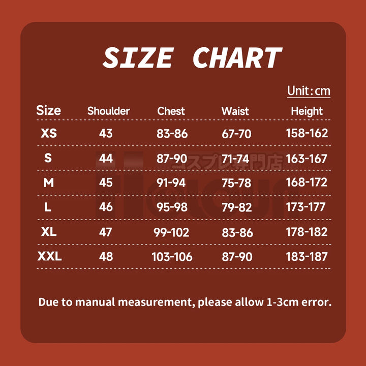 As all of our costume is hand-sewn, the finished costume may vary by approximately one (1-2) inch in either direction of the specified measurements.