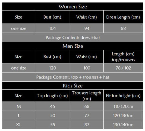 • Package content:              for men/boy: top + pants + hat;            for women/girl: dress + hat