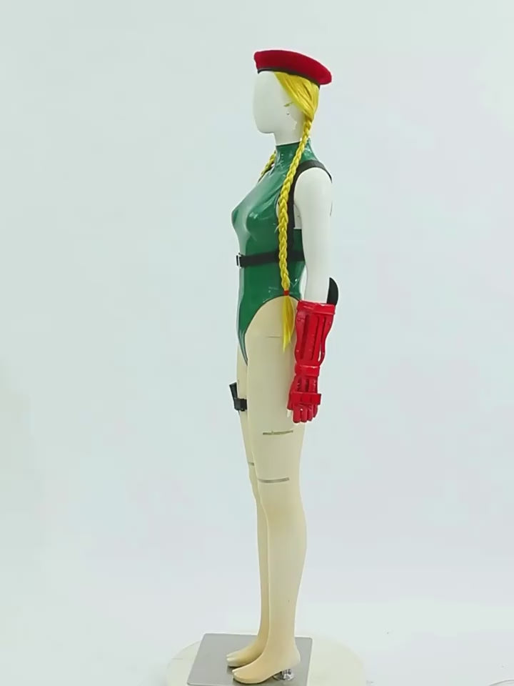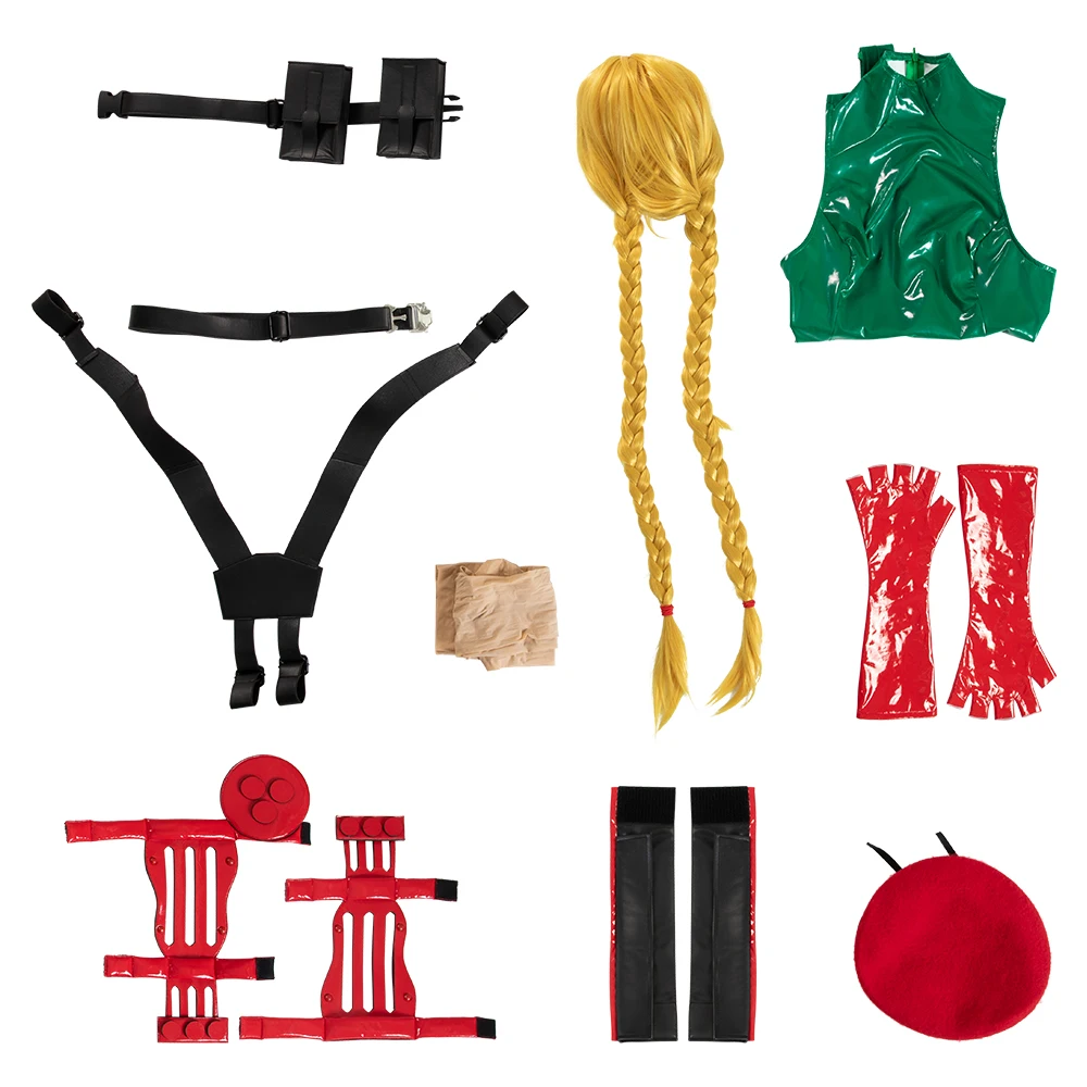 Full set Components:1. Bikini *1,2. Gloves *2,3. Strap components *1,4. Leg bag components *1,5. Leg cover *2,6. Hat *1,7. Wrist brace *2,8. Wig *1,9. Head tie *2,10. Stockings *1(There're a few options for different components.Please check the picture corresponding to the option carefully to make sure what you bought is what you want.For example,you'll receive only the mask if you choose the option "mask" ,the other components are not included.)