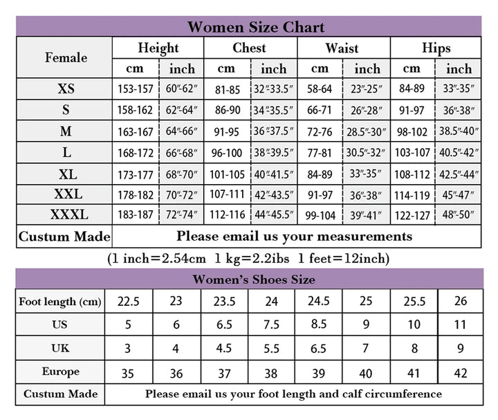 As all of our costume is hand-sewn, the finished costume may vary by approximately one (1-2) inch in either direction of the specified measurements.