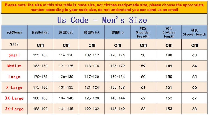★Warm tip: the numbers listed are equal to the body size, not the clothing size.