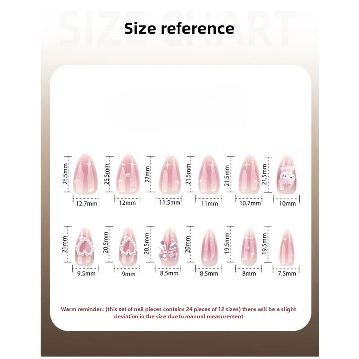 24pcs Short Almond Nail Press on Pink Blush Hello Kitty Rhinestone 3D Bowknot White Pearl Heart Design Acrylic False Nails Tips