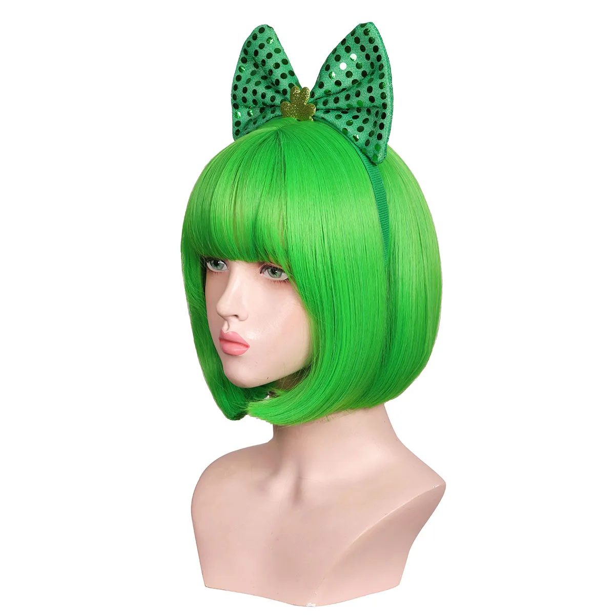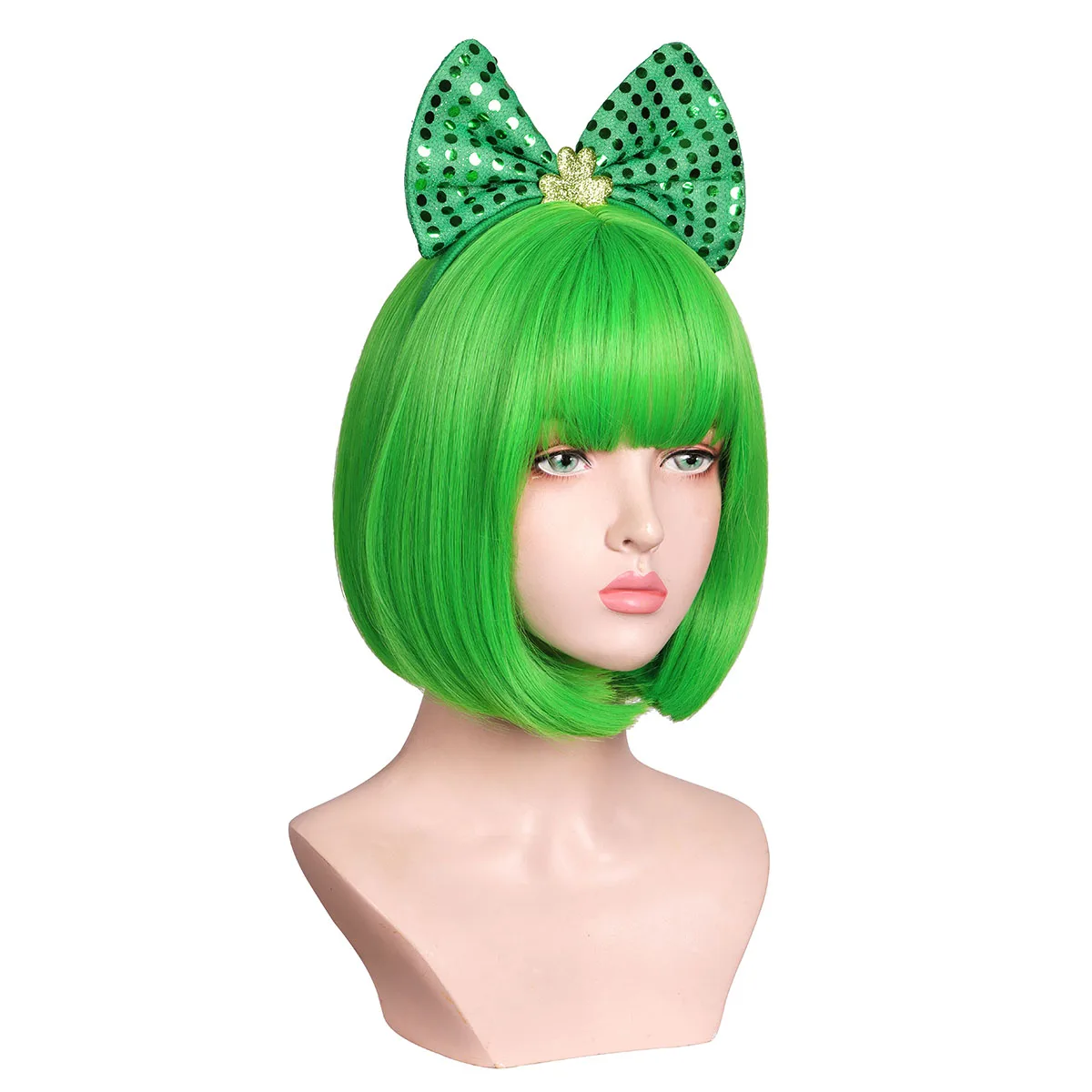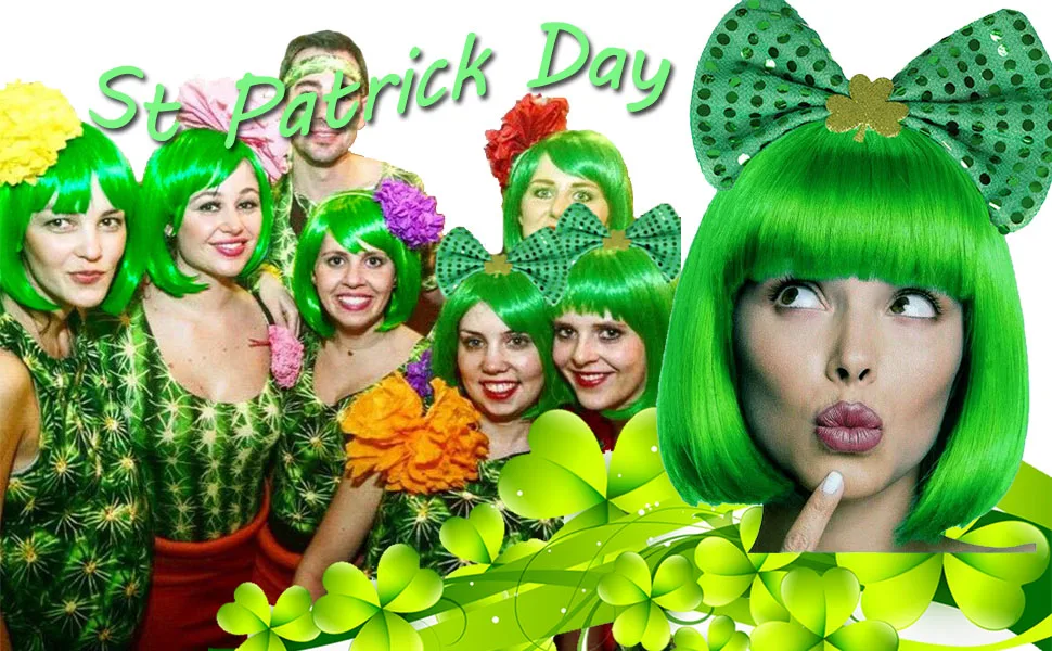 Kyo Short Green and Bobs Cosplay Wig with Headband and Clover Glasses for St Patrick a Day
