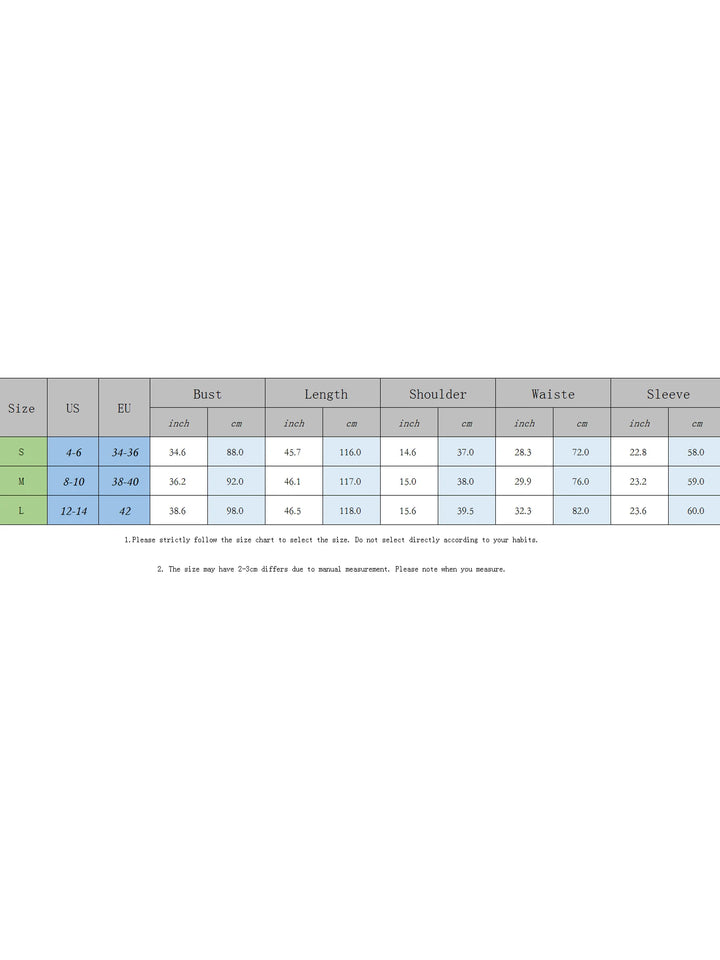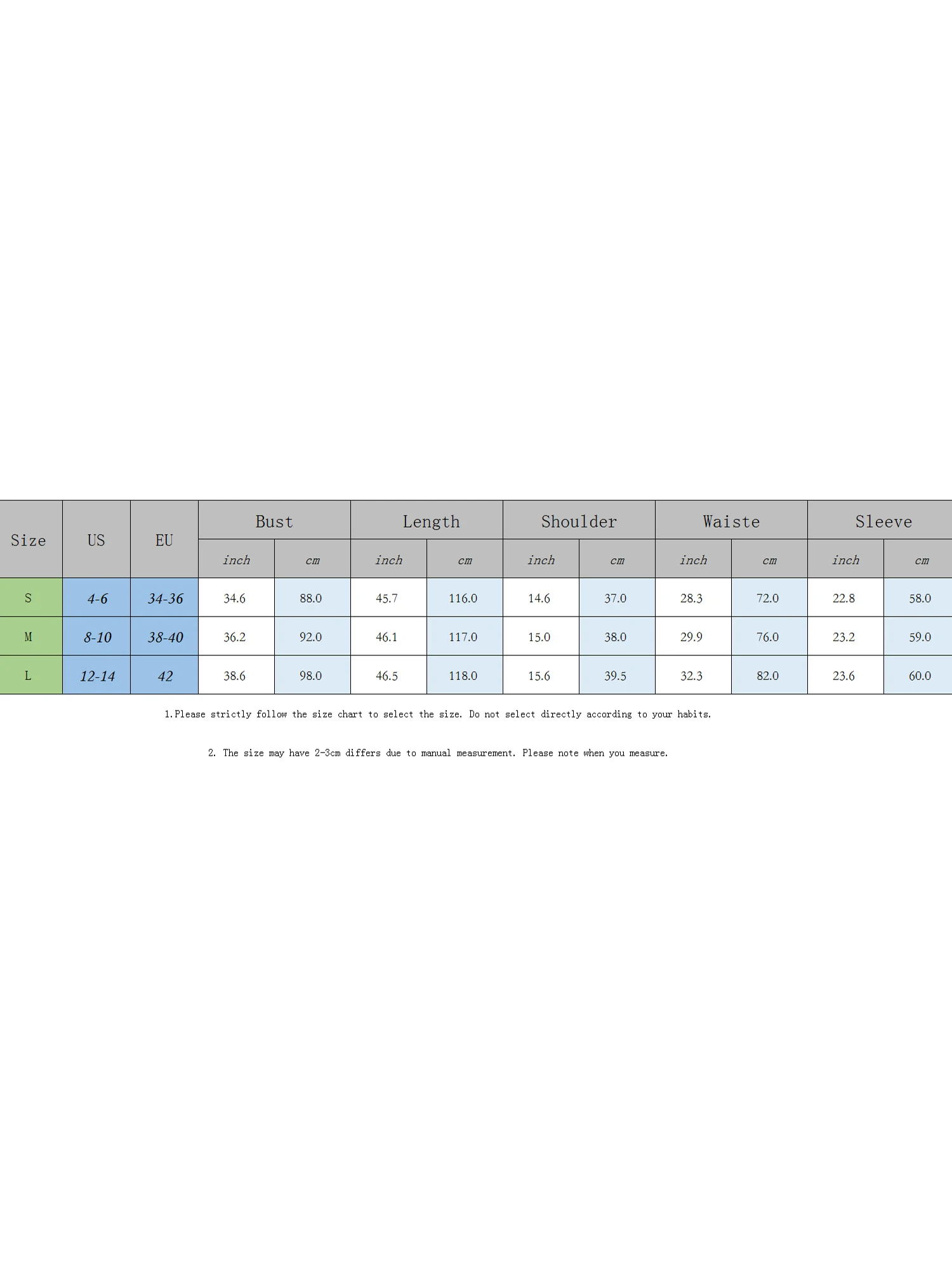 L Length: 46.46 Bust: 38.58 Sleeve: 23.62 Shoulder: 15.55 Waist: 32.28