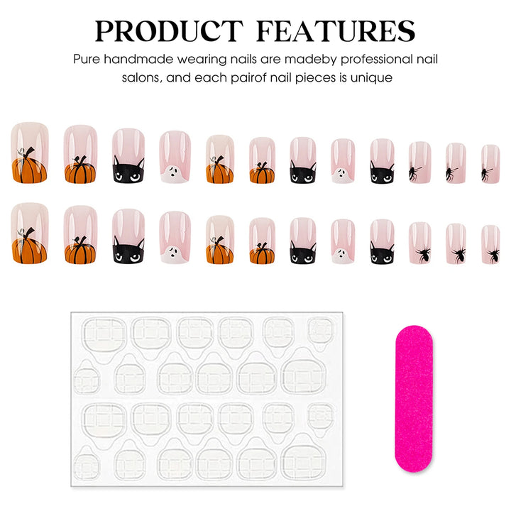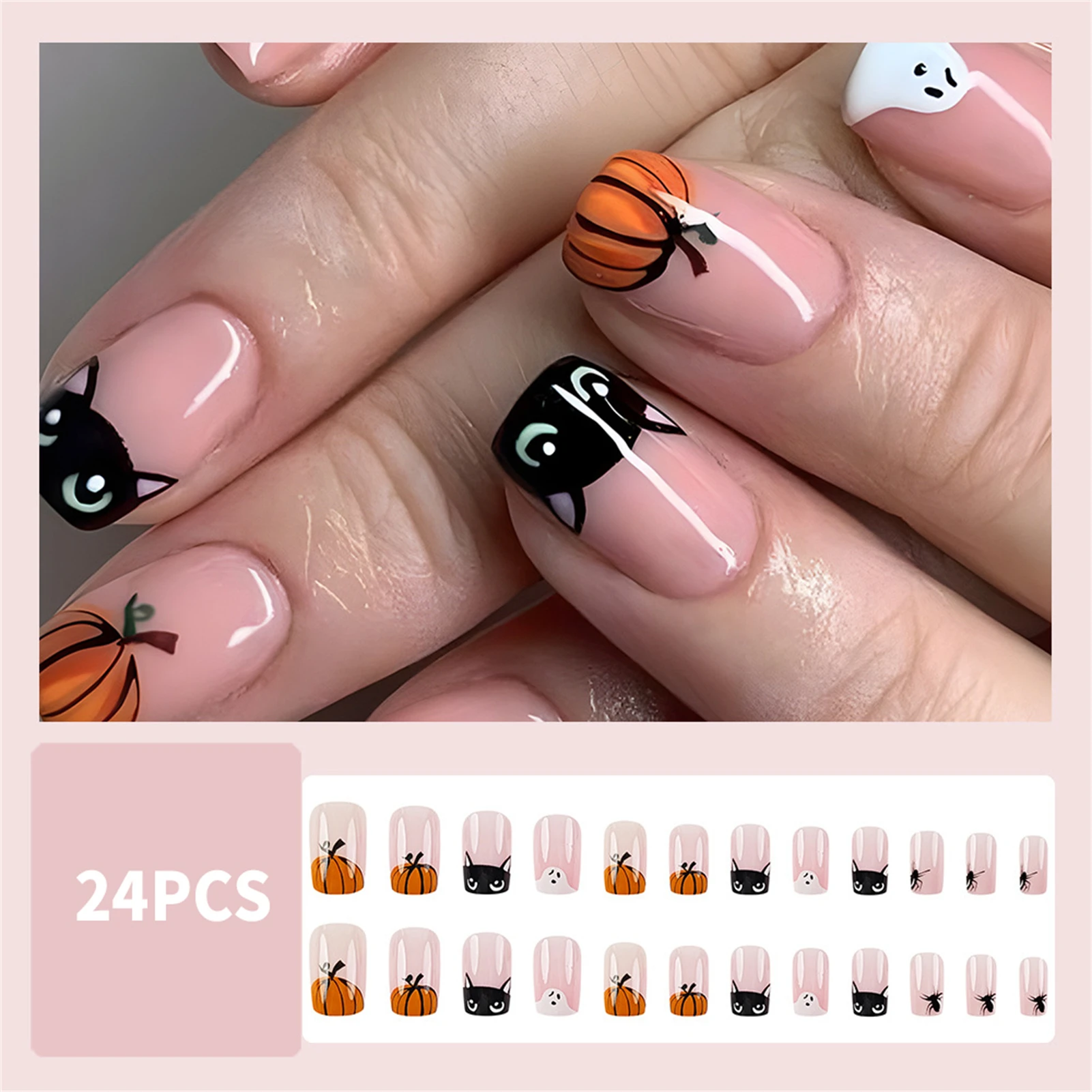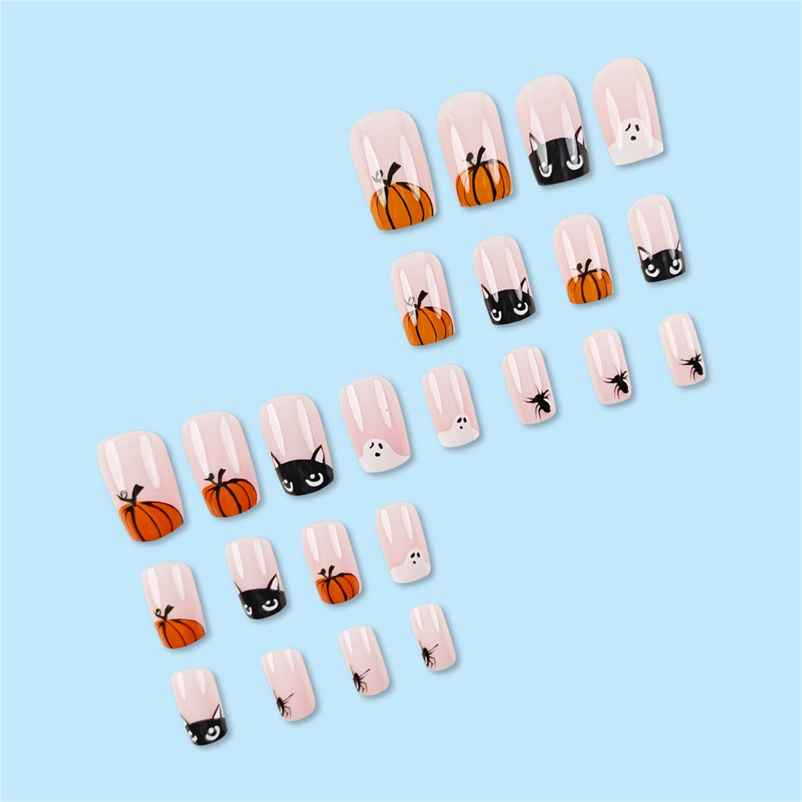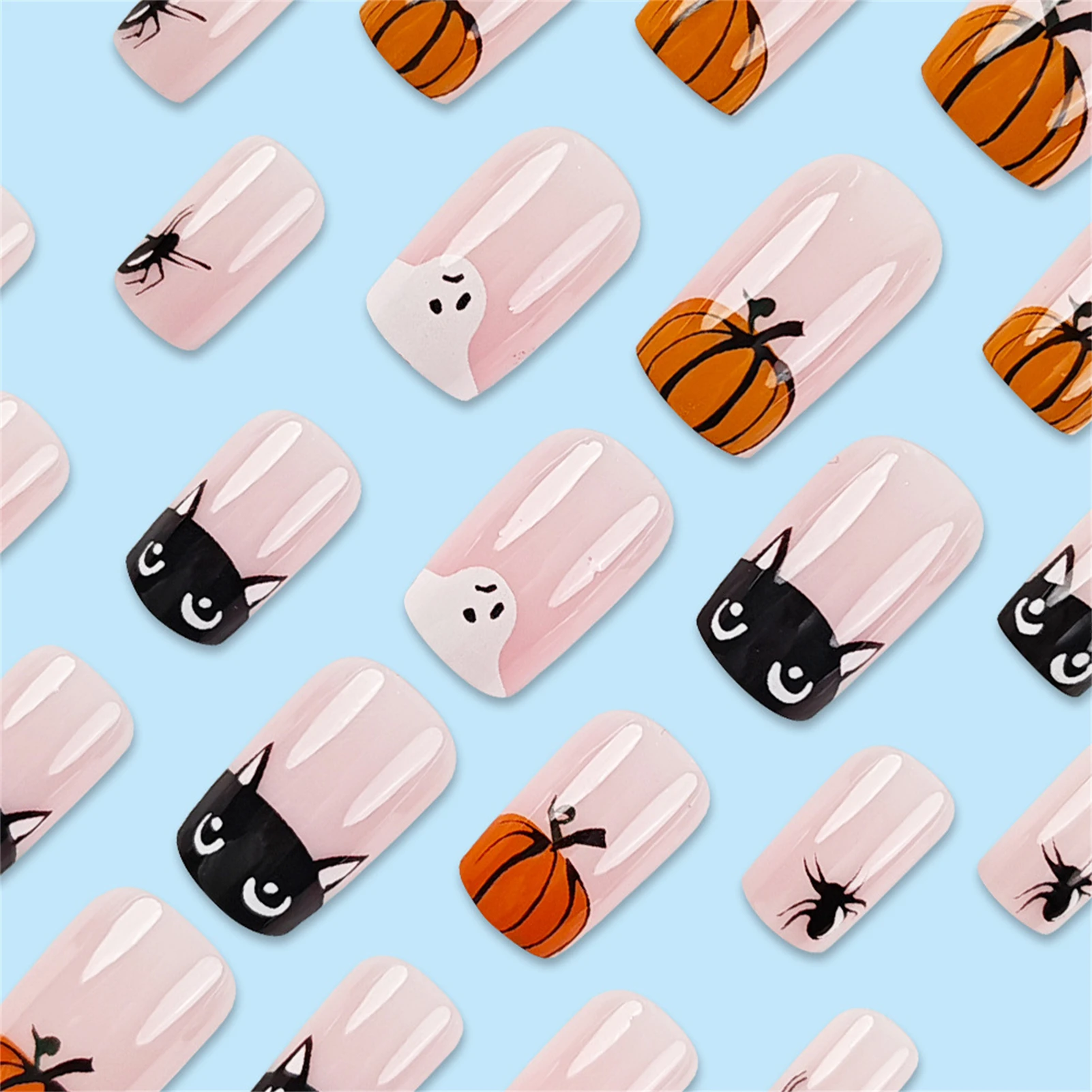 24pcs Halloween Cute Cartoon French Fake Nails Nude Pink Square Press On Nails With Pumpkin Ghost Designs Professional Nail Art