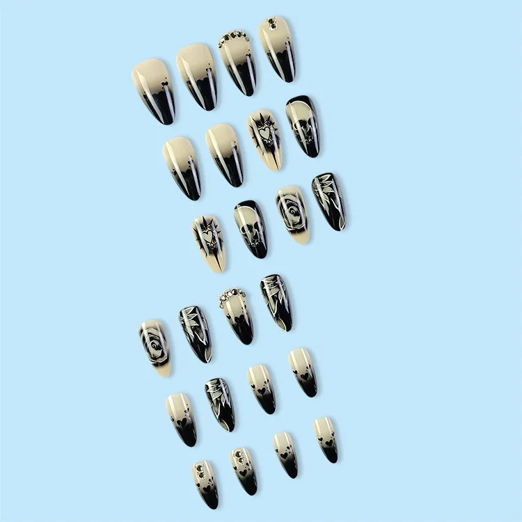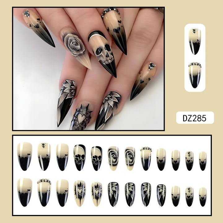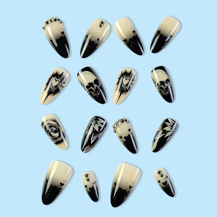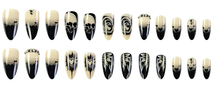 Halloween Press on False Nail Black Rose Print Stick on Fake Nails Almond Acrylic Tips Nail Skull Head Nail Art for Women 24 Pcs