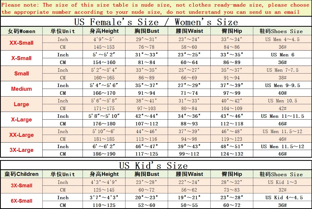 ★Warm tip: the numbers listed are equal to the body size, not the clothing size.