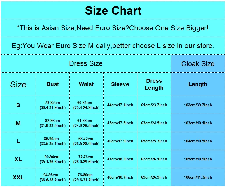 As all of our costume is hand-sewn, the finished costume may vary by approximately one (1-2) inch in either direction of the specified measurements.