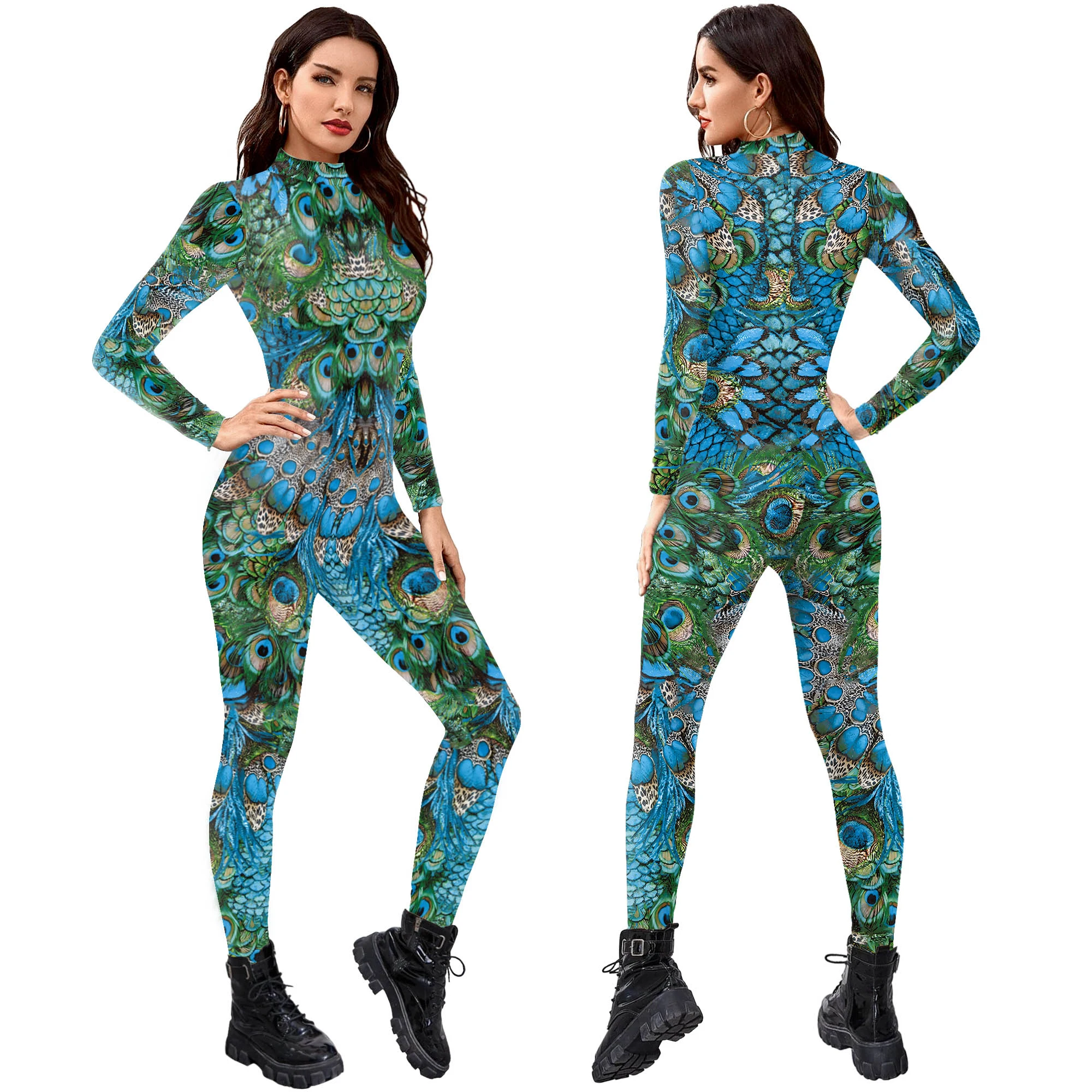 Peacocks a Feather Printing Sexy Slim Bodysuit Skinny Carnival Cosplay Costumes Fancy Outfit Catsuit Overalls