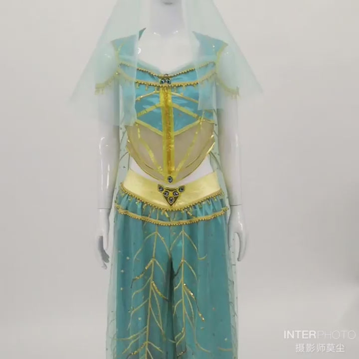 Aladding Princess Jasmines Naoming Scotting Green Blue Dress Cosplay Costume and Accessories