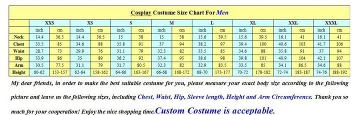 As all of our costume is hand-sewn, the finished costume may vary by approximately one (1-2) inch in either direction of the specified measurements.