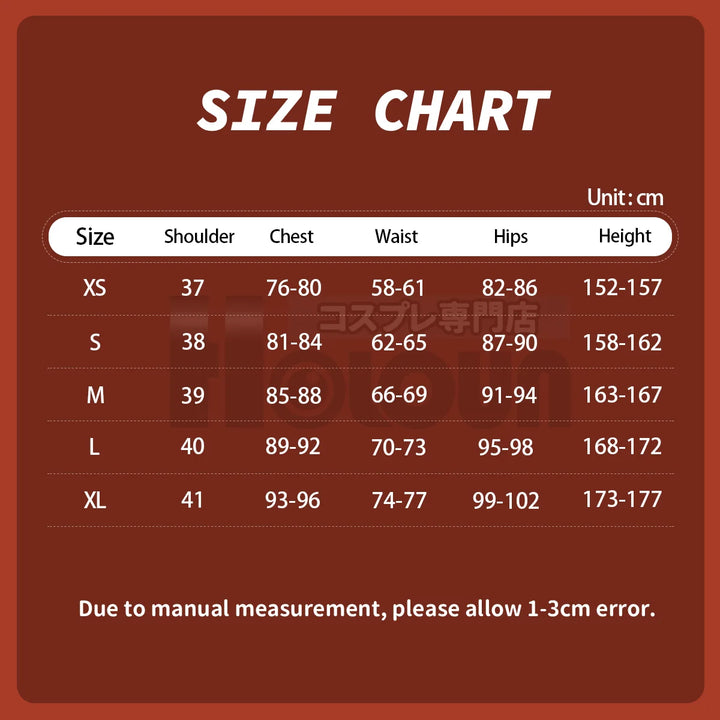As all of our costume is hand-sewn, the finished costume may vary by approximately one (1-2) inch in either direction of the specified measurements.