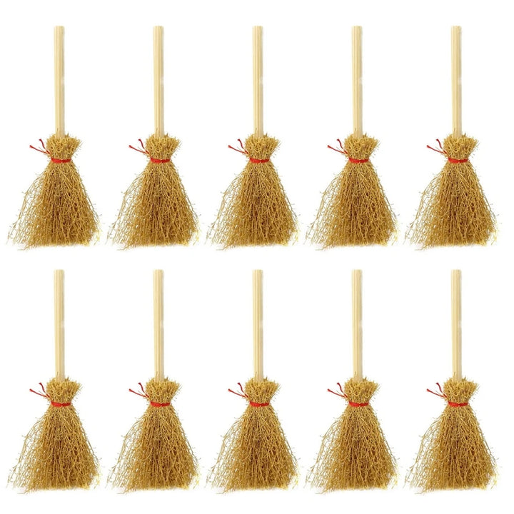 10PCS Mini Broom Witch Straw Brooms DIY Hanging Ornaments for Halloween Party Decoration Costume Props Dollhouse Accessories