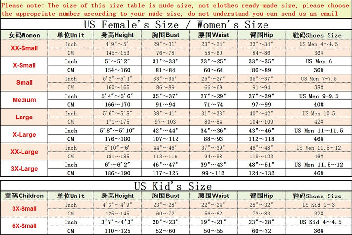 ★Warm tip: the numbers listed are equal to the body size, not the clothing size.