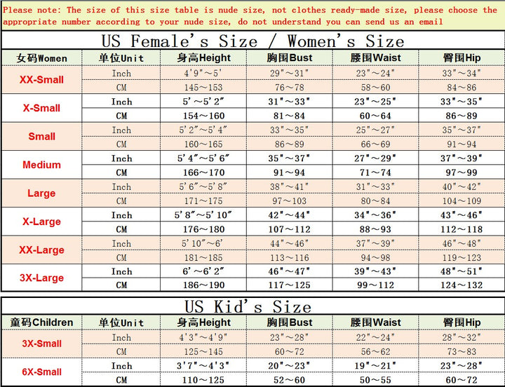 ★Warm tip: the numbers listed are equal to the body size, not the clothing size.