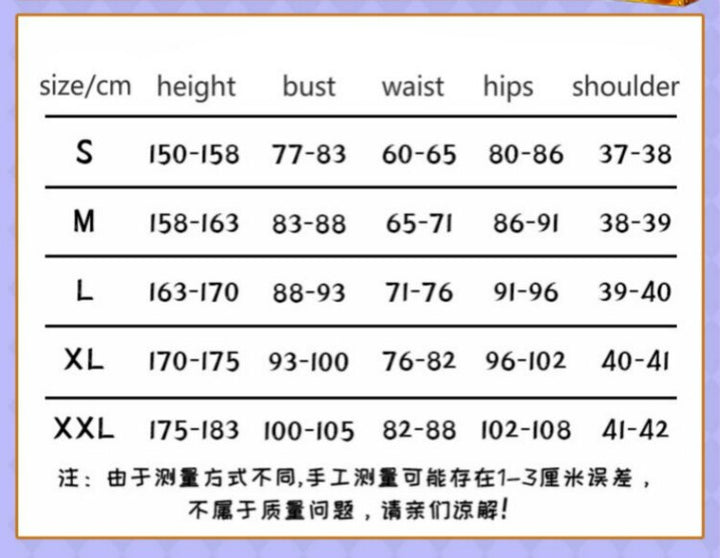 As all of our costume is hand-sewn, the finished costume may vary by approximately one (1-2) inch in either direction of the specified measurements.