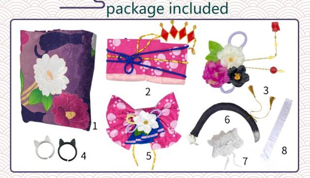 1,kimono 2,belt 3,headwear 4,ring 5,bow 6,tail 7,legband 8,sock