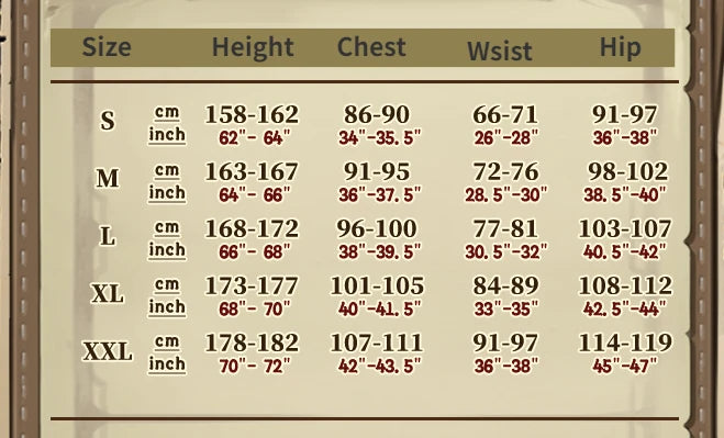 As all of our costume is hand-sewn, the finished costume may vary by approximately one (1-2) inch in either direction of the specified measurements.