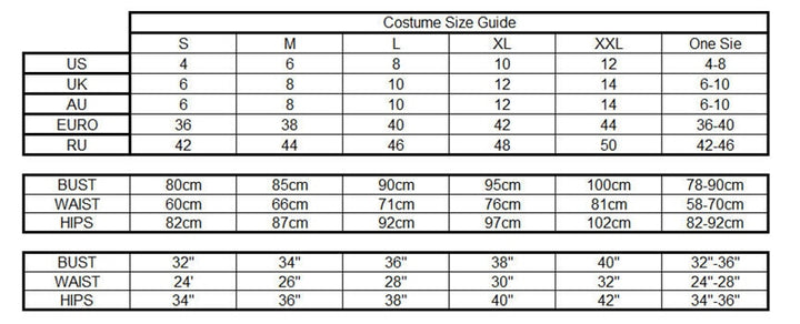 As all of our costume is hand-sewn, the finished costume may vary by approximately one (1-2) inch in either direction of the specified measurements.