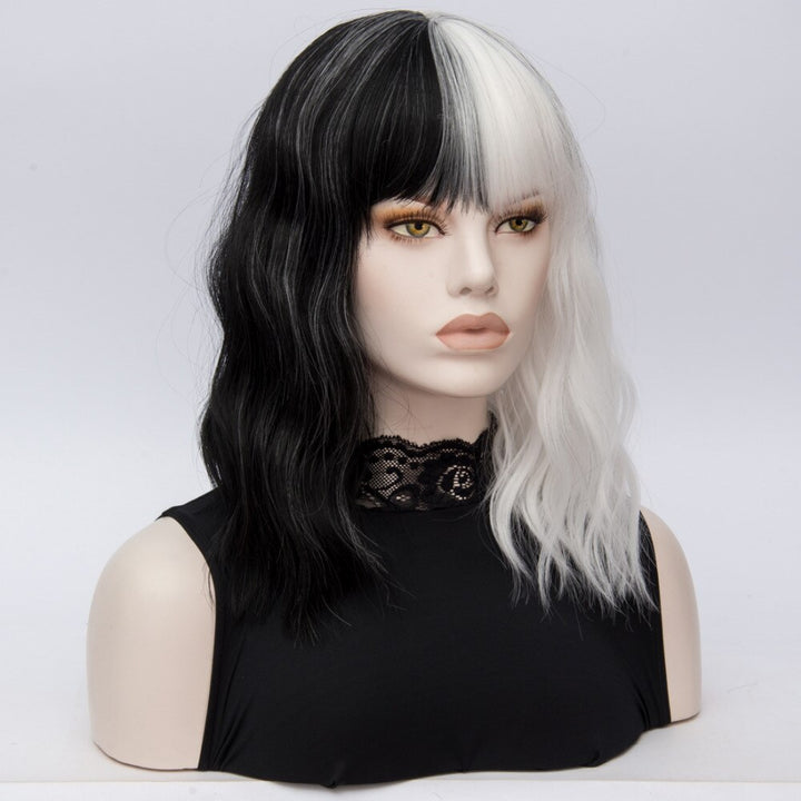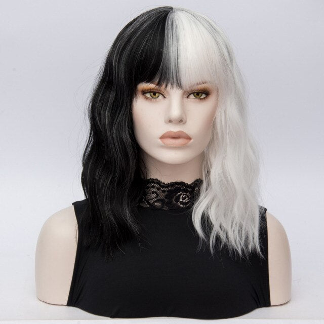 Cruellala Cosplay Devilleles Wigs Curly Half White Half Black Heat Resistant Synthetic Hair Wig + Wig Cap