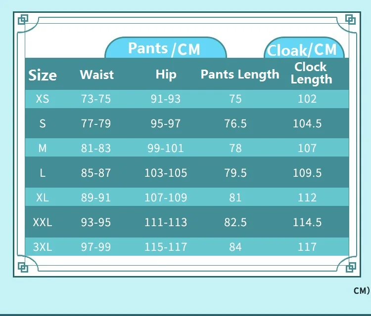 As all of our costume is hand-sewn, the finished costume may vary by approximately one (1-2) inch in either direction of the specified measurements.