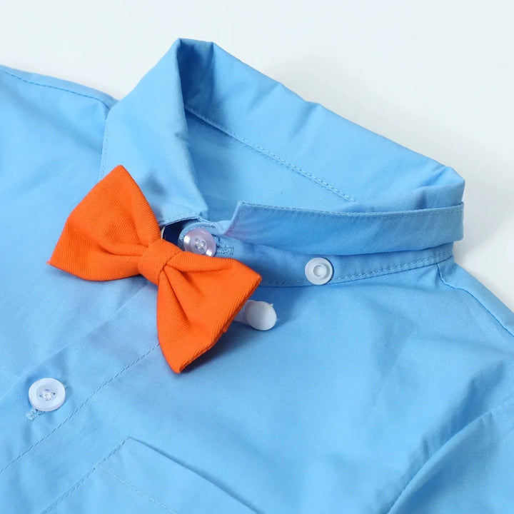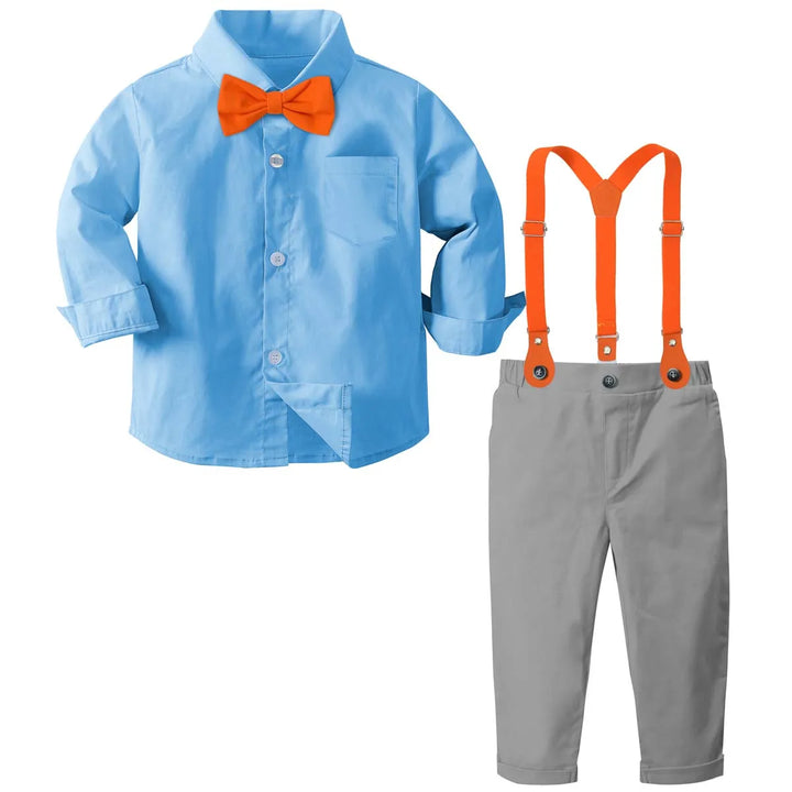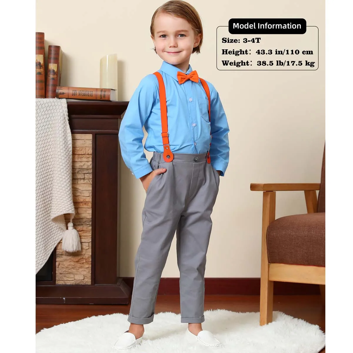 Toddler kids boy suit are made of cotton blend that is soft, breathable and comfortable. It's consists of long sleeve dress shirt, elastic-waist pants, detachable bow tie, stretch suspender and driver cap.