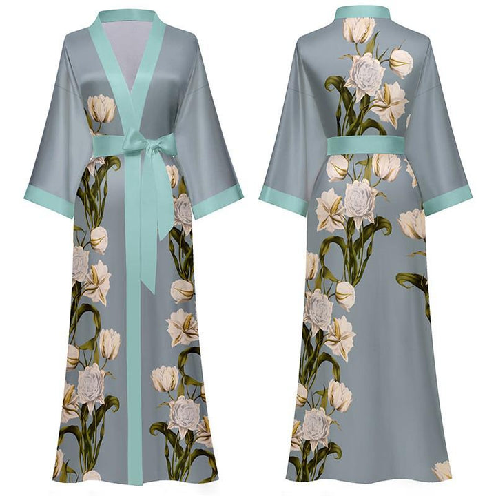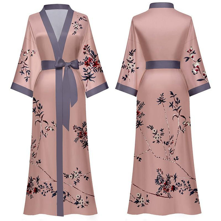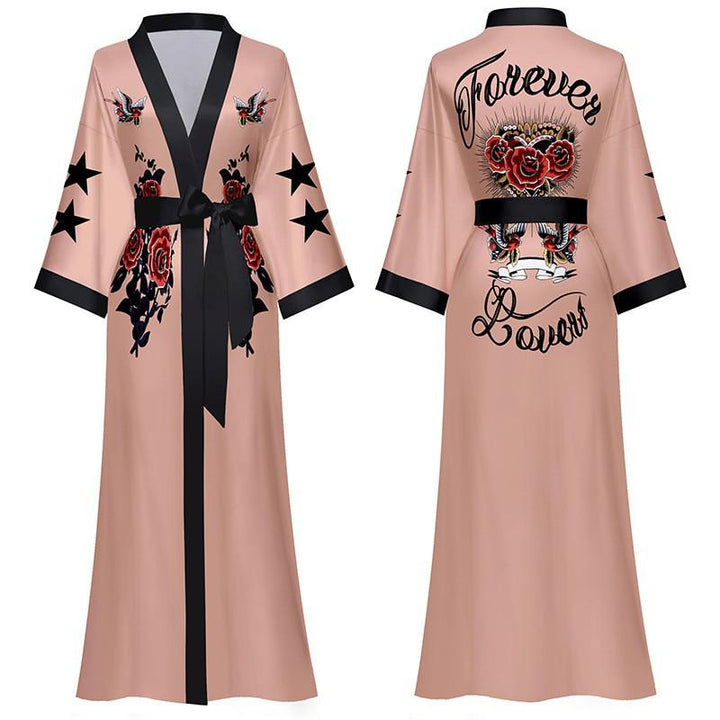New Spring Summer Women Long Robe Kimono Bathrobe Gown Sexy Black Print Sleepwear Nightgown Casual Half Sleeve Satin Home Dress