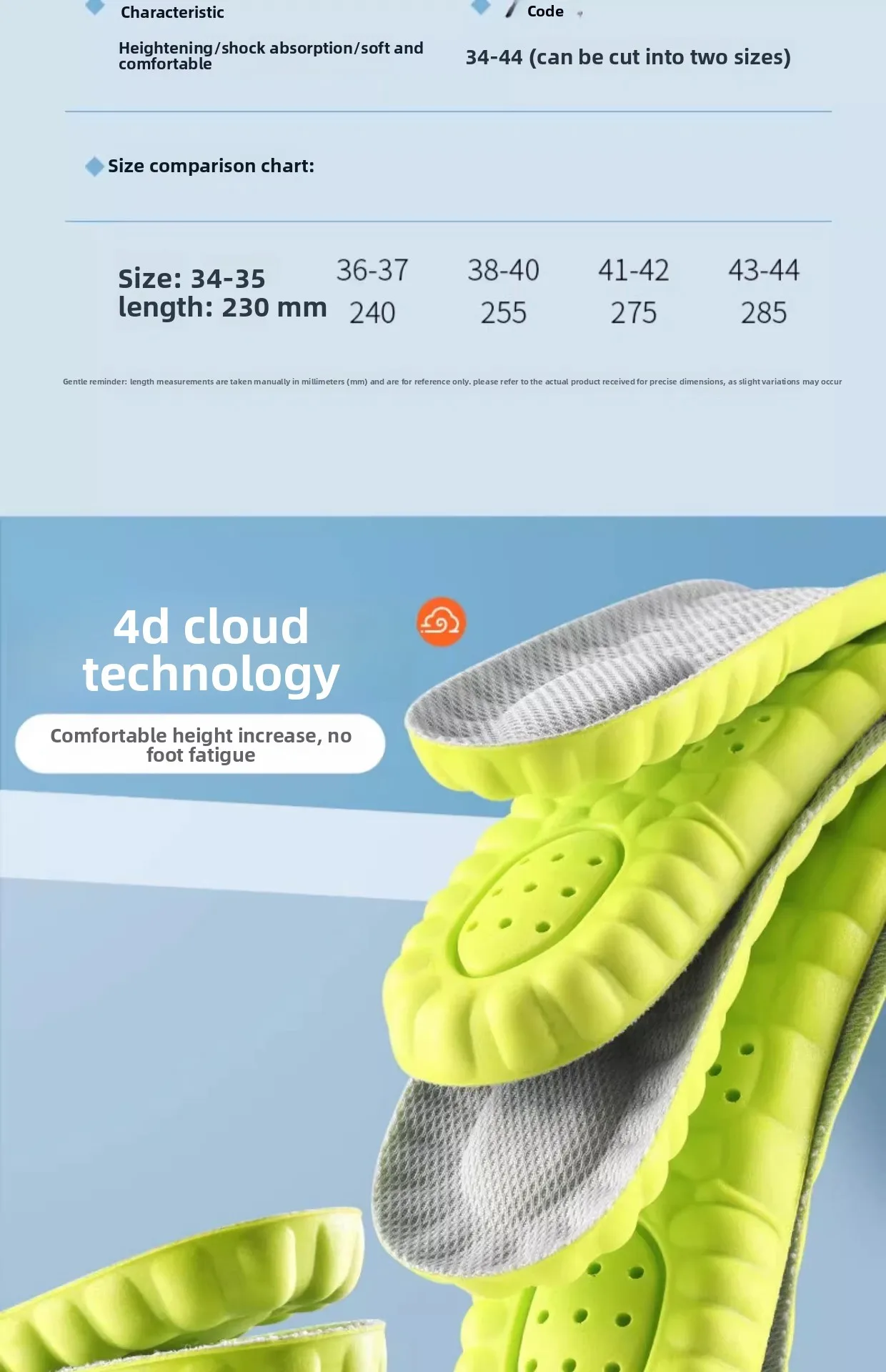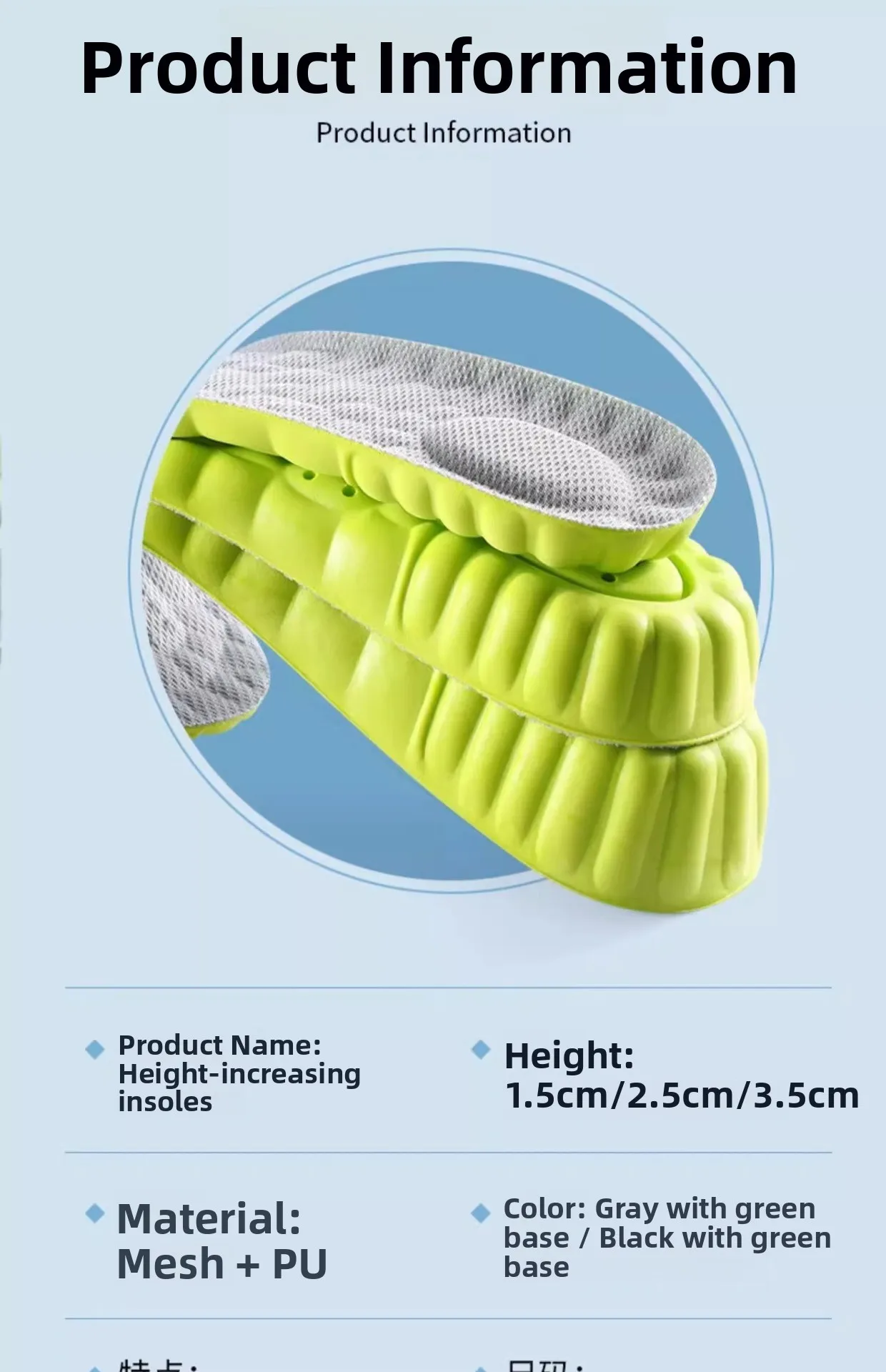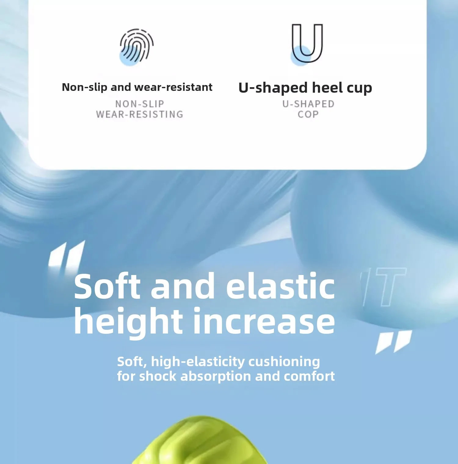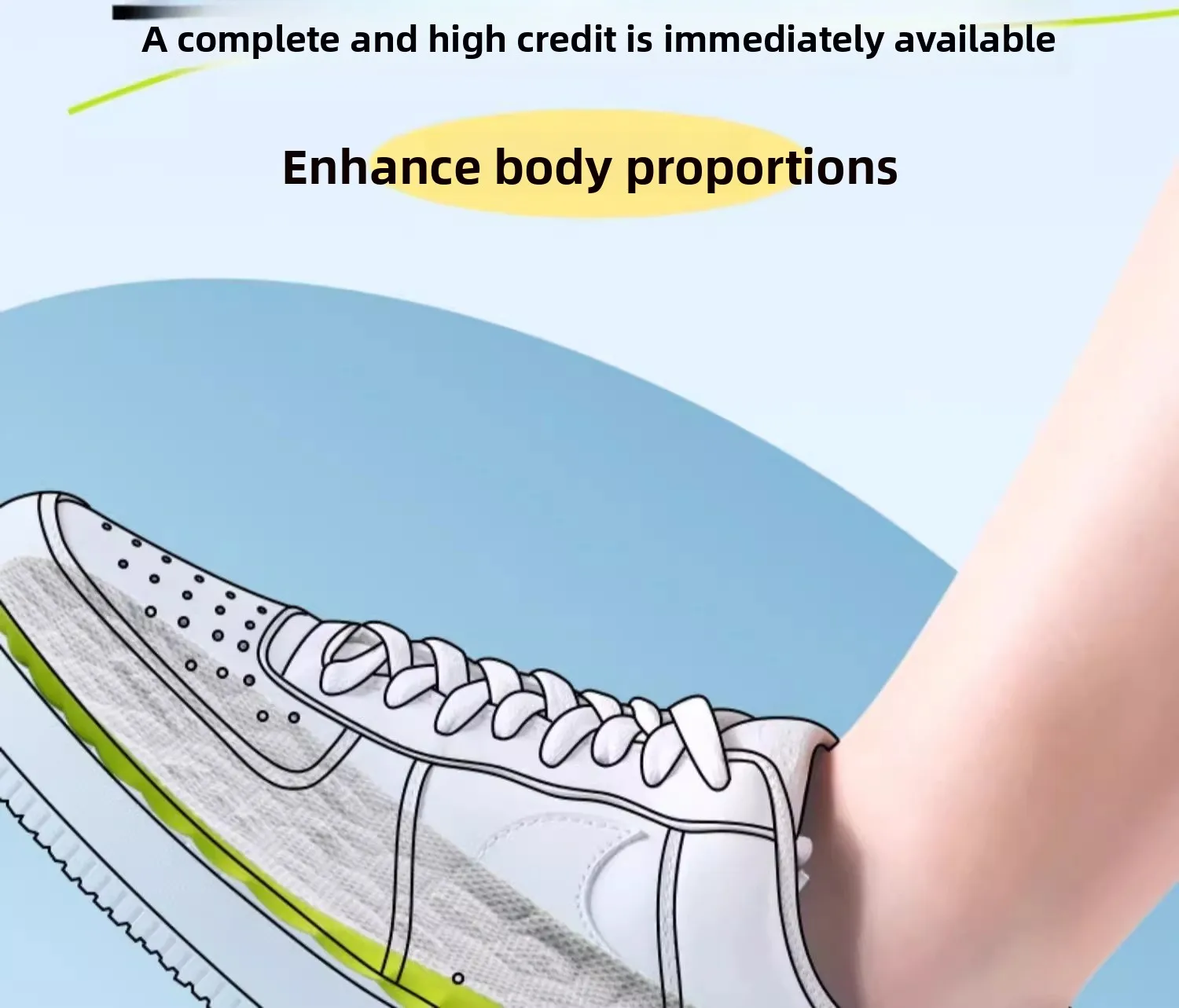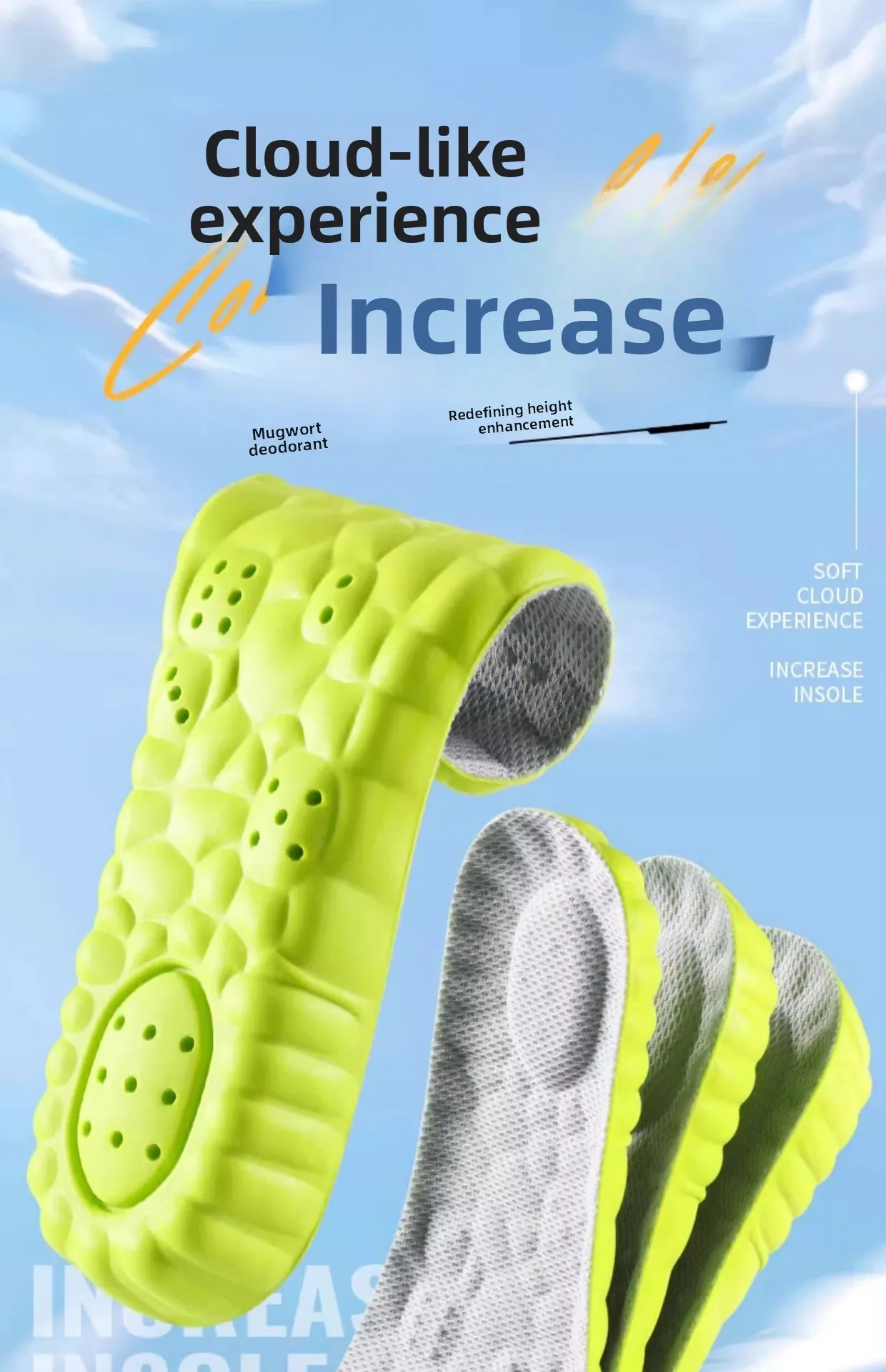 The insoles feature a sporty design that not only enhances height but also provides shock absorption, reducing foot fatigue during long walks or runs.
