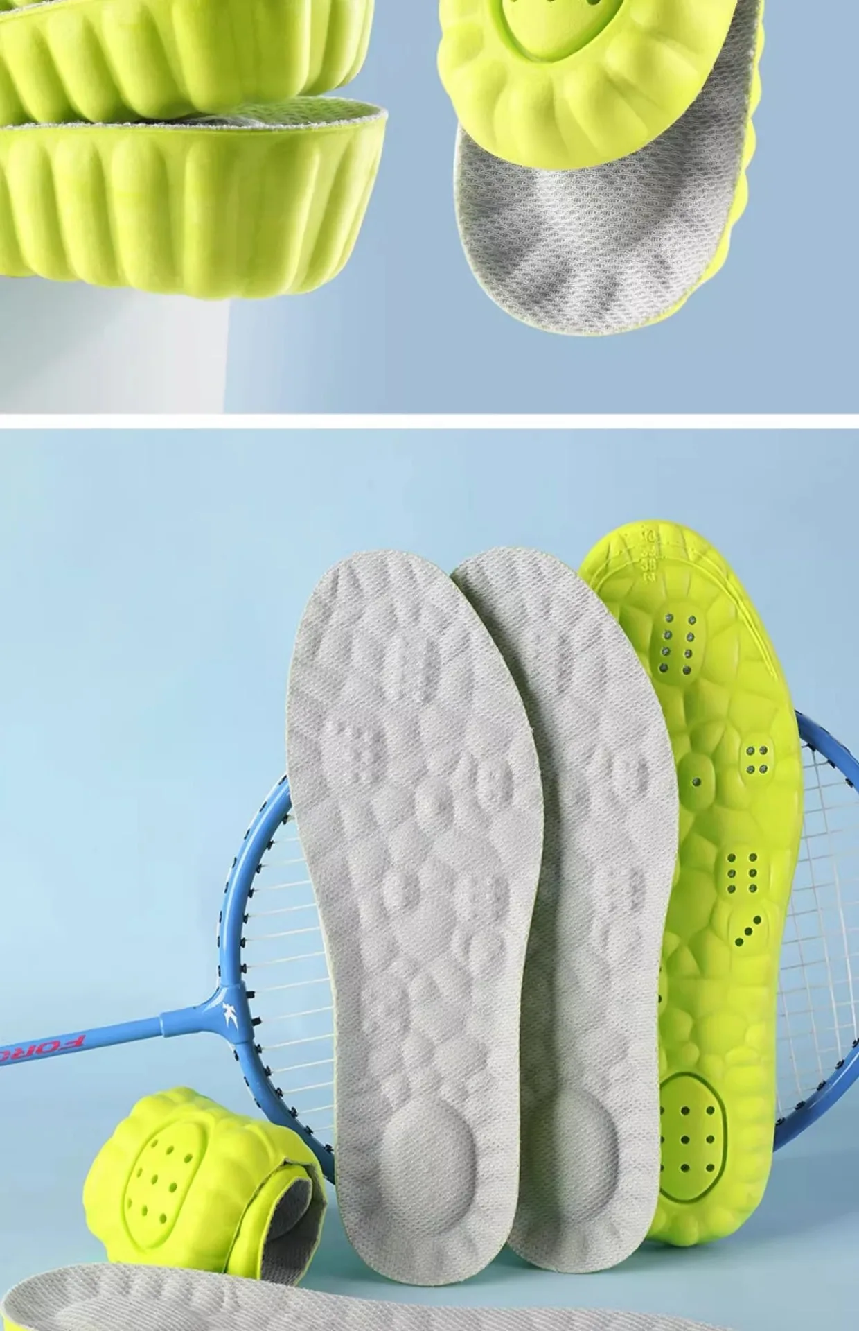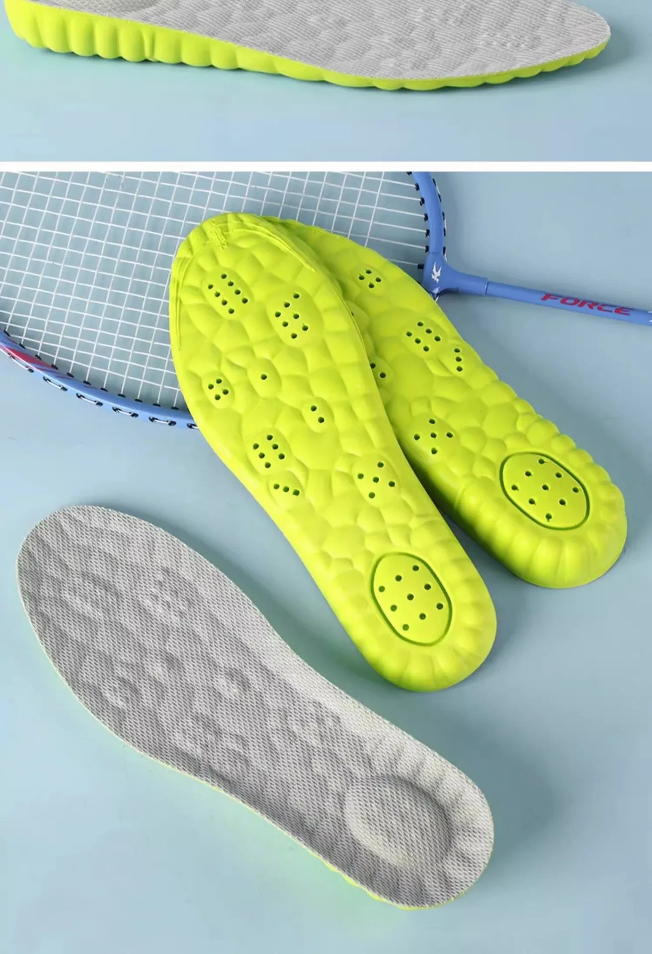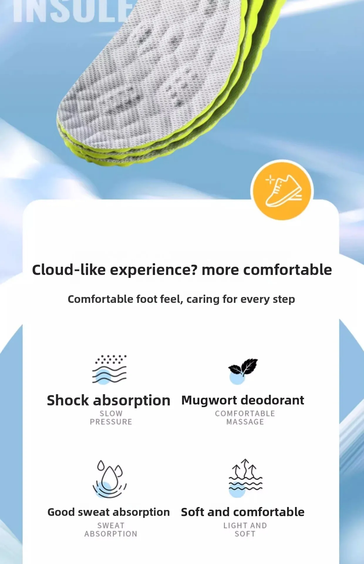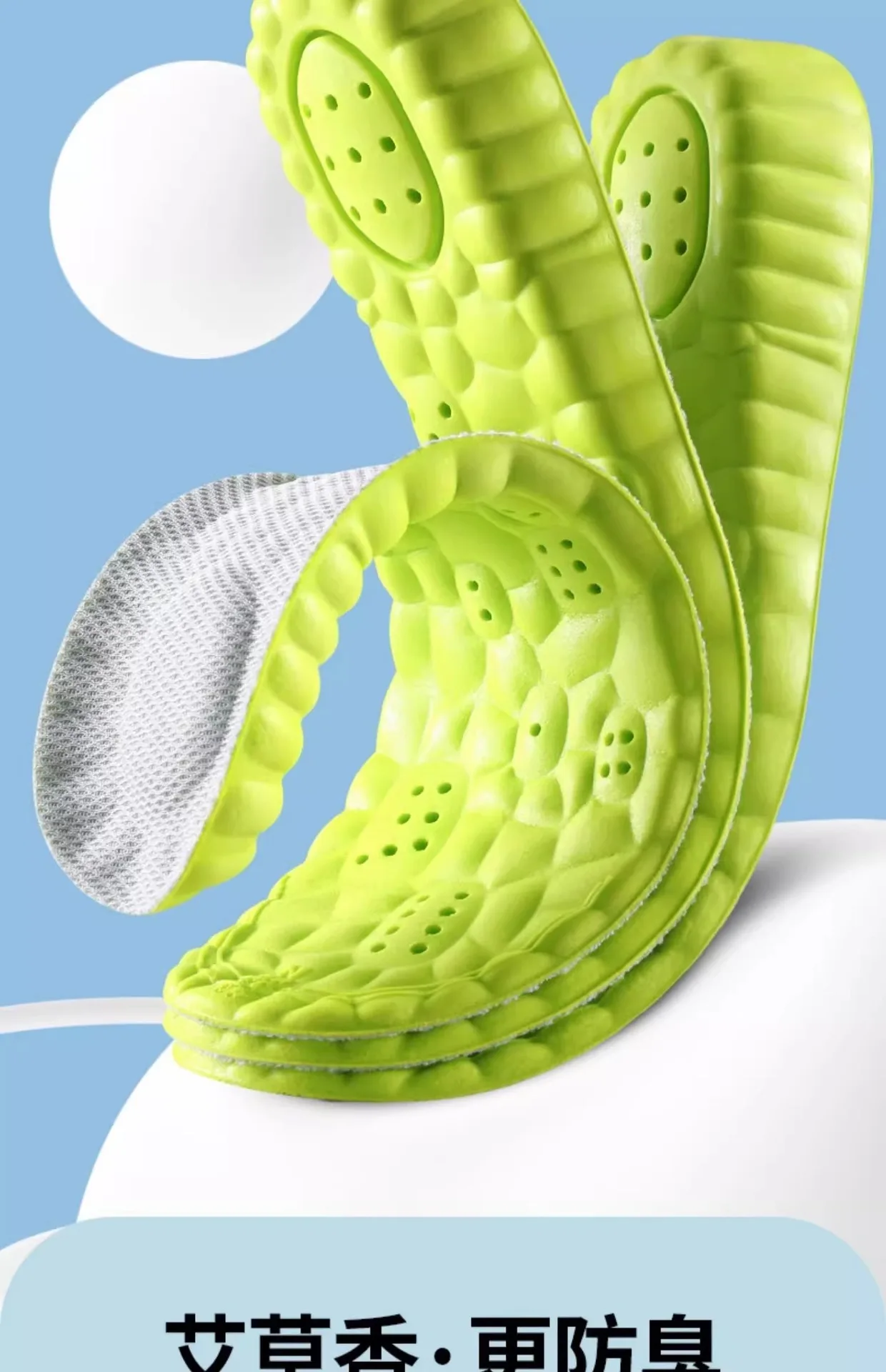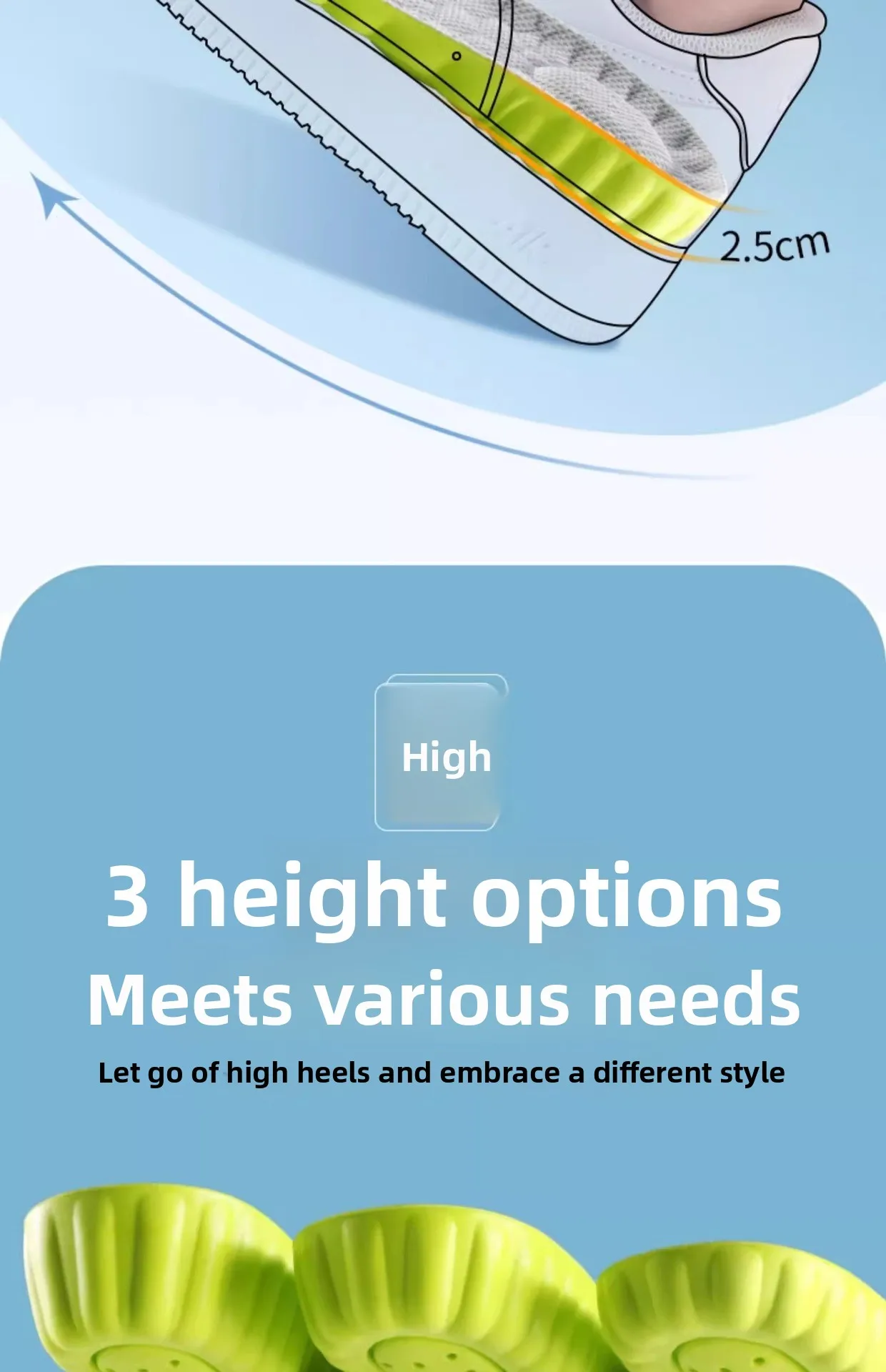 The insoles feature a sporty design that not only enhances height but also provides shock absorption, reducing foot fatigue during long walks or runs.
