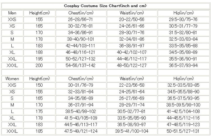 As all of our costume is hand-sewn, the finished costume may vary by approximately one (1-2) inch in either direction of the specified measurements.